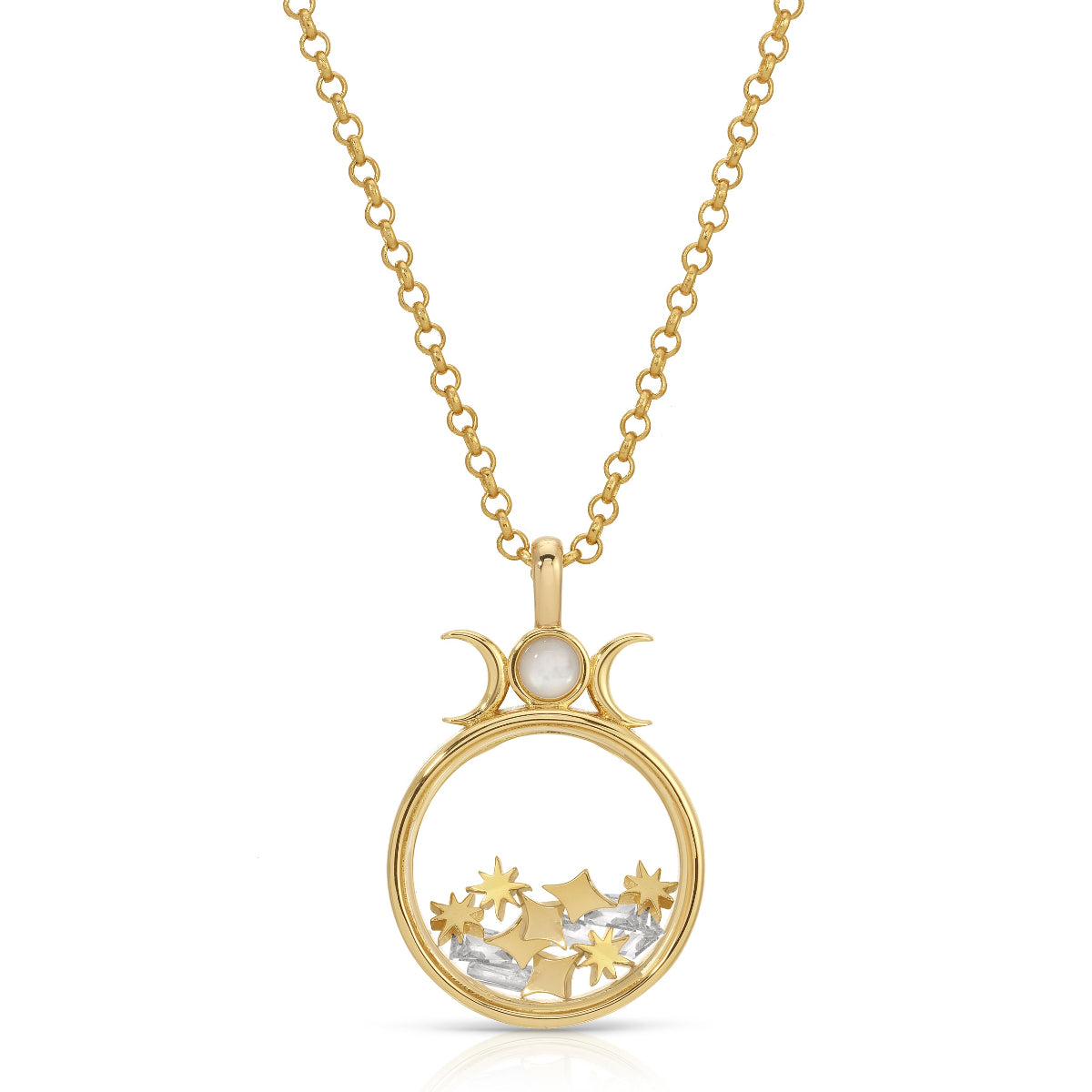 A tiny universe for all your wishes! This dreamy floating locket features a luminous Mother of Pearl full moon surrounded by two delicate crescent moons. A celestial trio symbolizing intuition, protection, and new beginnings. Inside, twinkling CZ stars and golden starbursts drift and dance with every movement, capturing light (and little wishes) like stardust in motion.