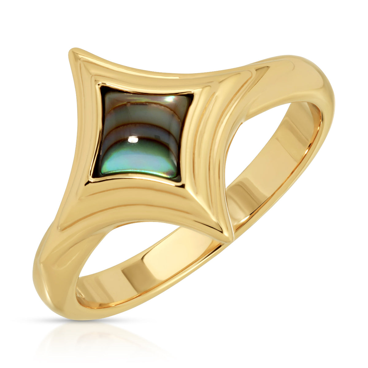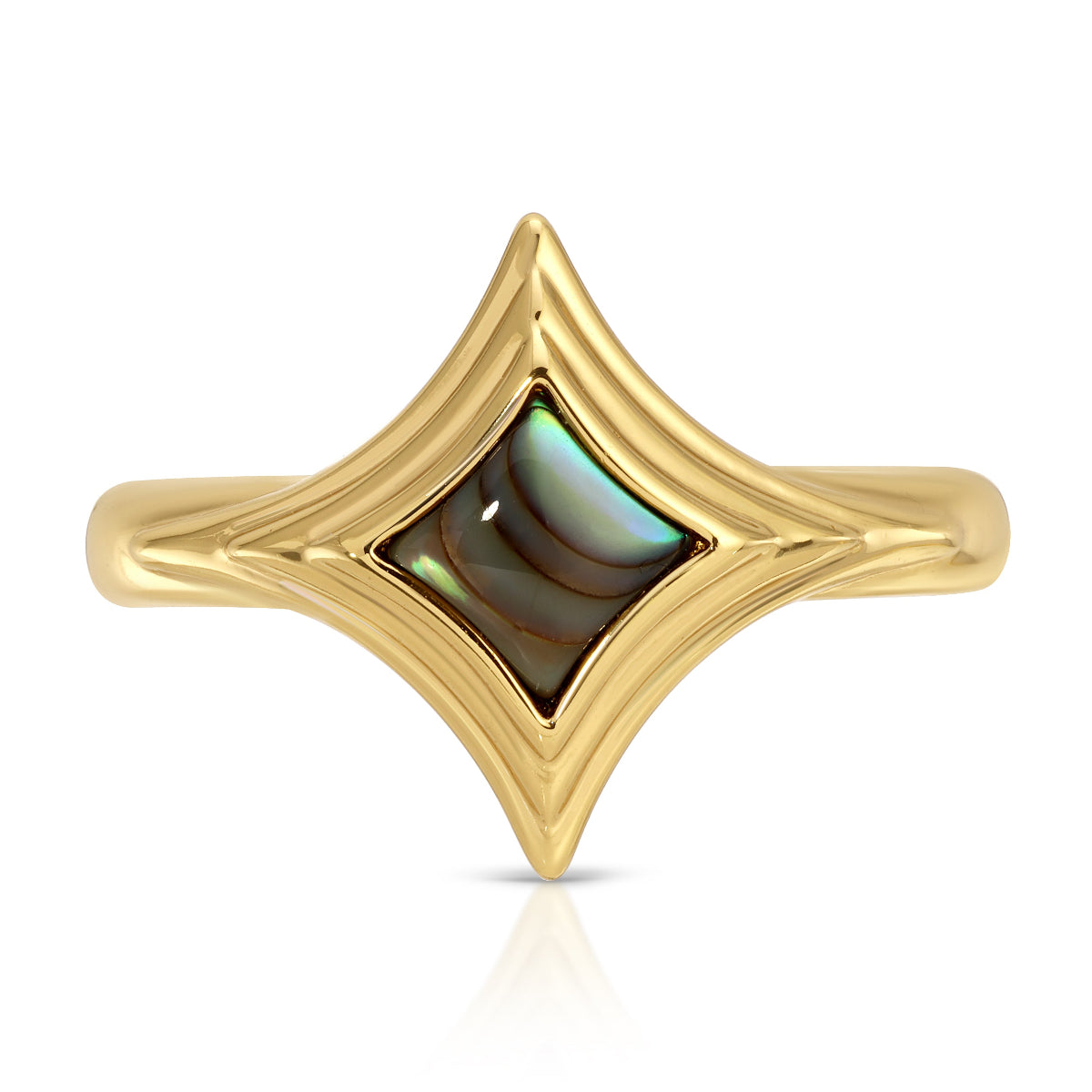 A celestial signet with a luminous gemstone center. Sculptural, radiant, and meant for instant cosmic energy.